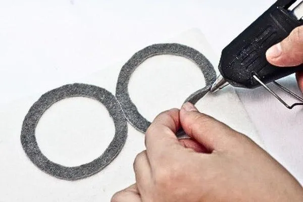 Glue the gray circles (goggles) side by side onto a piece of white craft felt. This white felt will act as the backdrop for your goggles.