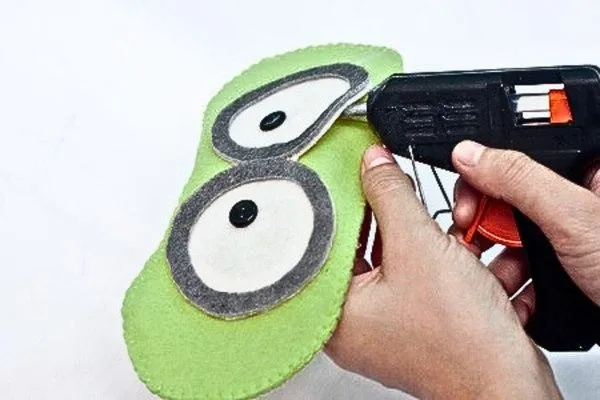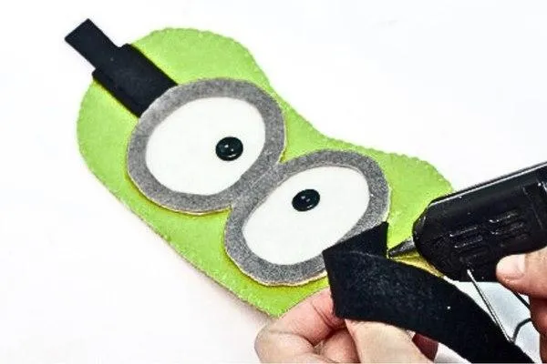 Using hot glue, attach the black felt strip on both sides of the gray goggles. This will make it look like the goggles are strapped onto the alien's face.