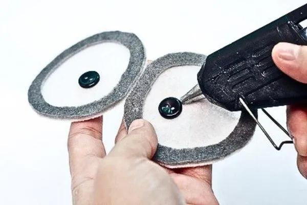 With your sharp scissors, cut away the excess white felt around the gray circles. The white felt peeking through the gray will look like the eyeballs