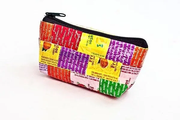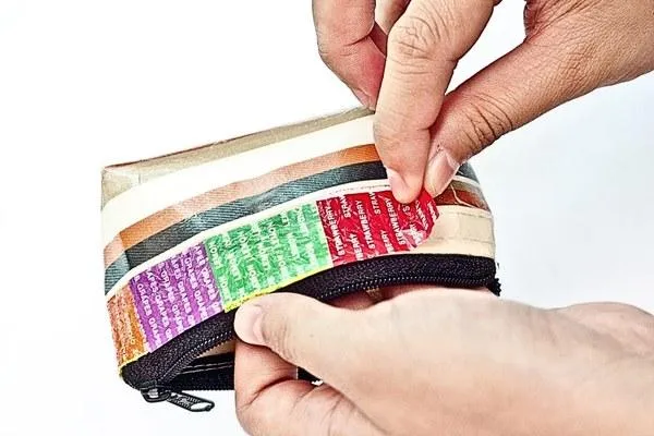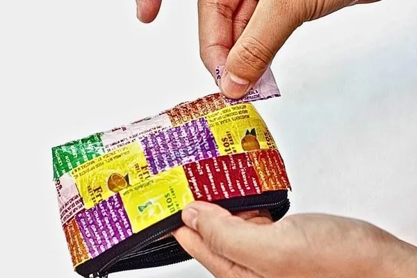 Keep adding more candy wrappers until the wallet is completely covered. If you see any gaps, fill them with smaller candy wrapper pieces to create a smooth, seamless design. Be proud of your colorful collage—it’s coming together beautifully!