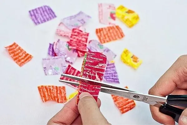Pick out colorful candy wrappers and cut them into small pieces using scissors. Aim for fun shapes like squares, rectangles, or uneven edges.