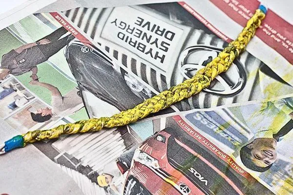 Braid the three newspaper rolls together, just like you would braid hair. Start at the taped end and work your way to the opposite end. Pull tightly as you braid to keep the wreath strong while maintaining an even texture throughout.