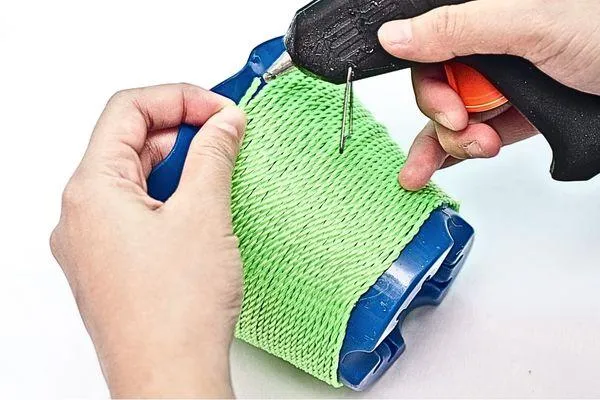 Cut another strip of newspaper and roll it tightly into a cylindrical shape to form the candle body. Adjust the roll until it reaches a height of roughly 2 inches. To secure the roll, glue the edges with hot glue to prevent unraveling.