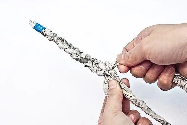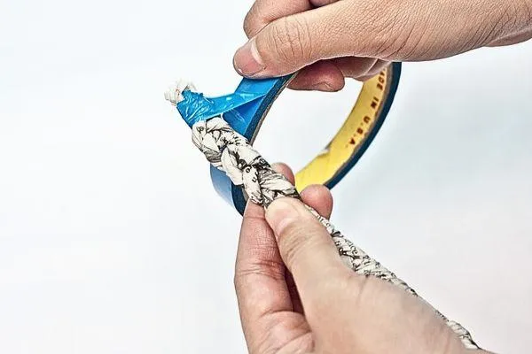 Take one end of each rolled newspaper tube and secure it tightly with green duct tape. Wrapping the tape firmly prevents the rolls from unraveling while ensuring a sturdy base for the braided wreath structure.