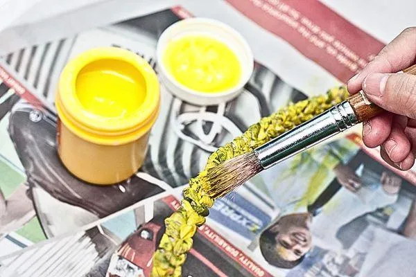 Using your paintbrush, coat the rolled candle with yellow paint. Cover the entire surface evenly, then let it dry. The bright yellow color will make the candle pop against the green wreath.