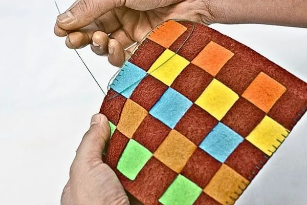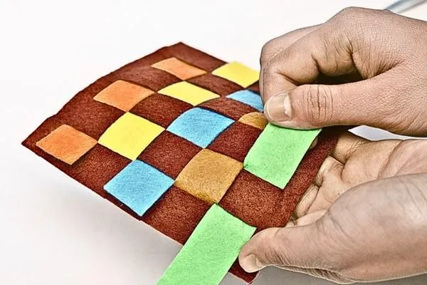 : Take your colored felt strips and weave them over and under the slits on the base felt, alternating with each strip. Ensure the strips sit tightly in place while creating a vibrant woven pattern. Adjust their placement for symmetry and make sure no spaces or gaps are visible.