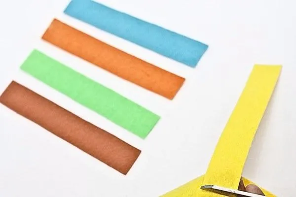 Take five pieces of felt in different colors and cut them into long, narrow strips, each measuring about 1.5 to 2 centimeters wide. These strips will soon be weaved into the base felt, creating the eye-catching design. Choose colors that contrast with your base felt to make the pattern stand out.