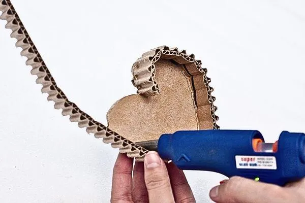 Apply hot glue along the edge of the bigger heart and carefully place the corrugated strip along the contour, starting at one side for a smooth application. Be patient and ensure it adheres securely.