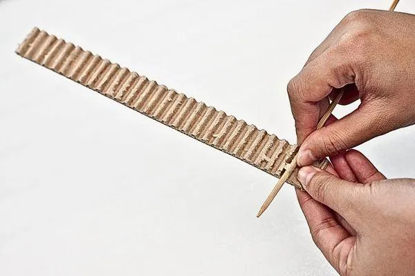 To give texture to the bigger heart, use the wooden skewer to corrugate it. Push the skewer through the cardboard's side openings and gently pull up, removing one layer to create a corrugated effect. Be gentle to avoid tearing the cardboard..