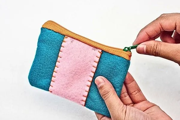 Align one side of the zipper (the side without the slider) with the edge of the purse, making sure it's right sides together. Then, sew it in place with a small running stitch. Do the same for the other side of the zipper.