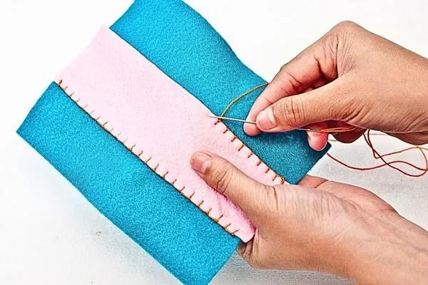 Now, place that pink strip right in the middle of the blue rectangle. The longer sides should match up. Sew the pink strip to the blue rectangle using a blanket stitch along its longest side.