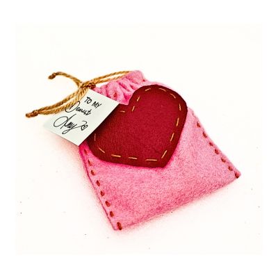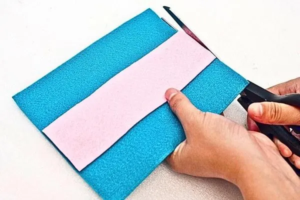 Next, cut a strip from the pink felt. It should be about 16 centimeters long and 5 centimeters wide. This pink strip will add a cute splash of color to our purse.