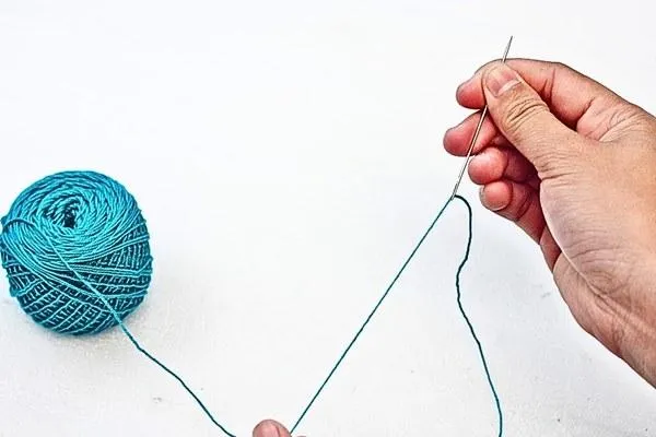 Swap your thread to the green-blue crochet thread. This color change will make our sewing blend in perfectly with the felt.