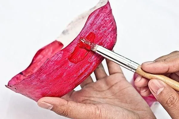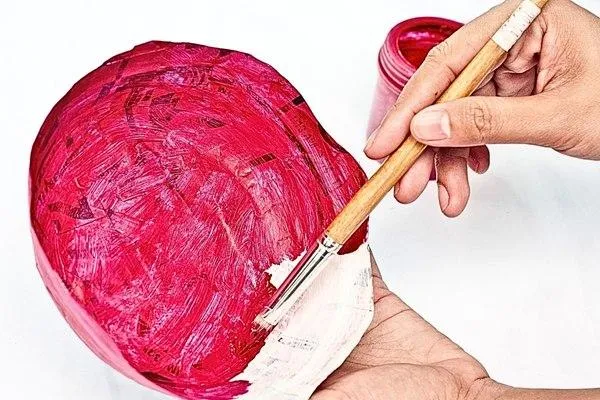 Paint both newspaper strips red using your paintbrush. Make sure to evenly coat each strip for a polished finish. Allow these painted strips to dry for several hours before proceeding further.