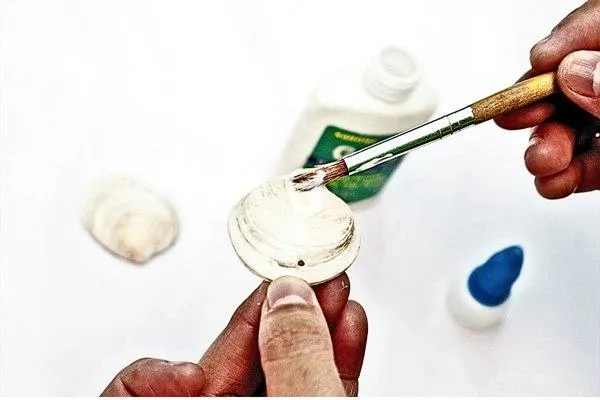 Take your small paintbrush and cover one side of each clamshell with a coat of white glue. Focus on the rough outer side of the shells—this is where you’ll add the glitter.