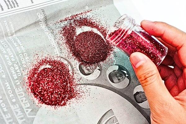 Generously sprinkle red glitter all over the glued side of the clamshells while working over the newspaper to catch any excess.