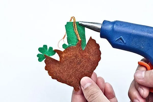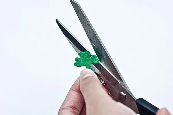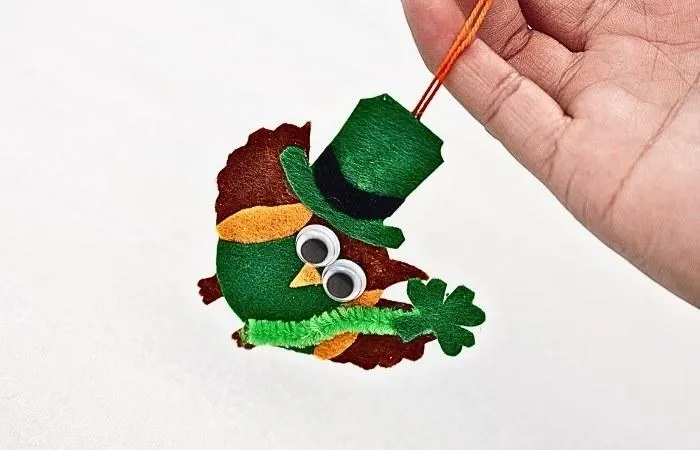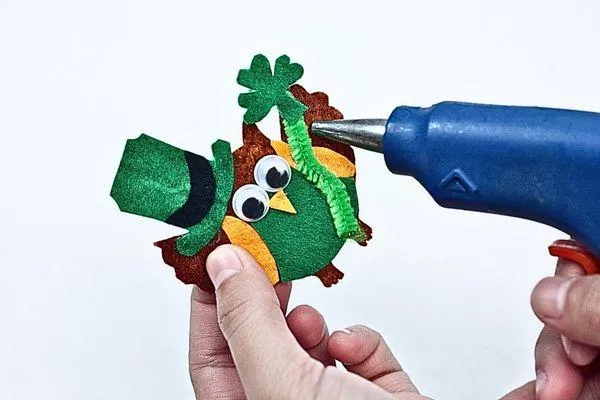 From the green felt, cut a tiny shamrock. This adds a lucky charm to our owl.