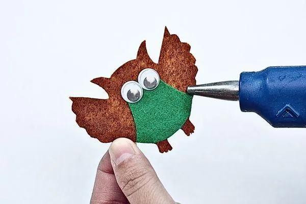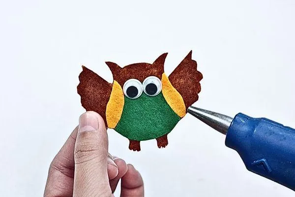 Snip a small, pointed triangle from orange felt for the owl's beak and glue it below the eyes.