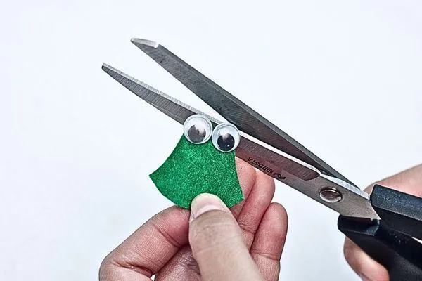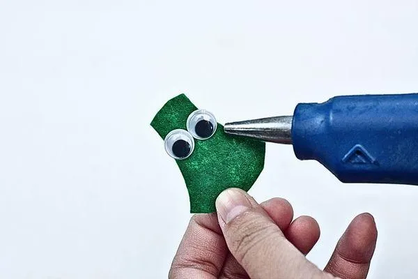 Glue the googly eyes onto the narrow upper part of the green body piece. This begins to bring our owl to life.