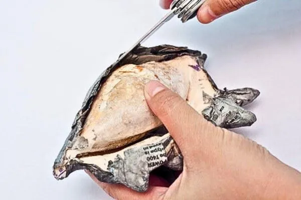Once dry, carefully lift the edges of the paper mache using a Swiss knife. Adults should handle this step. Kids can watch and learn how the hardened shell begins to separate from the model underneath.