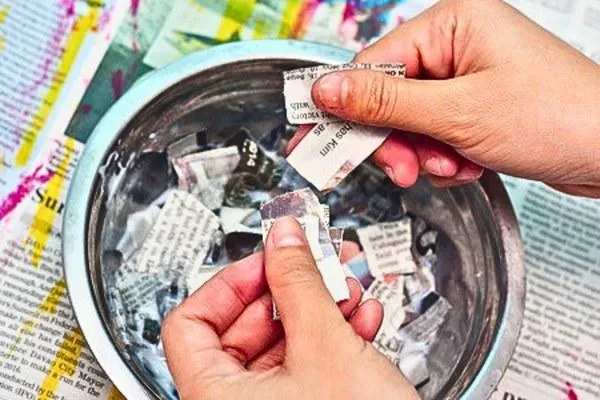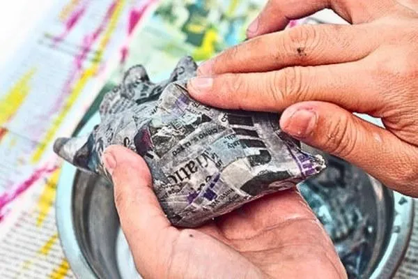 Cut the newspaper into several small strips. Short strips are easier for kids to handle and mold around curves. Dip each strip into the glue mixture, making sure it’s fully soaked.