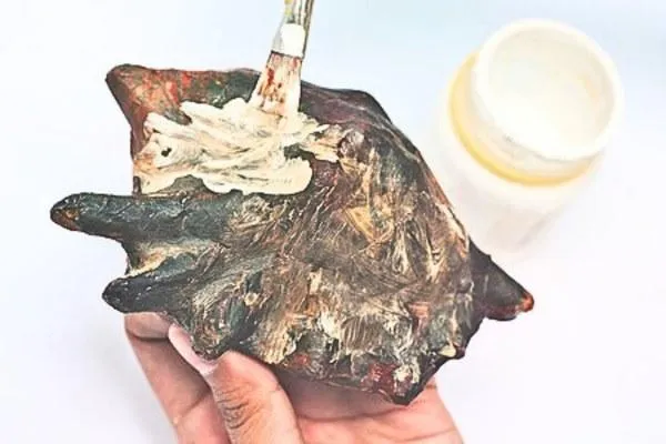While the orange paint is still wet, lightly brush some white paint over it. This makes a cool brown color and adds depth to the shell.