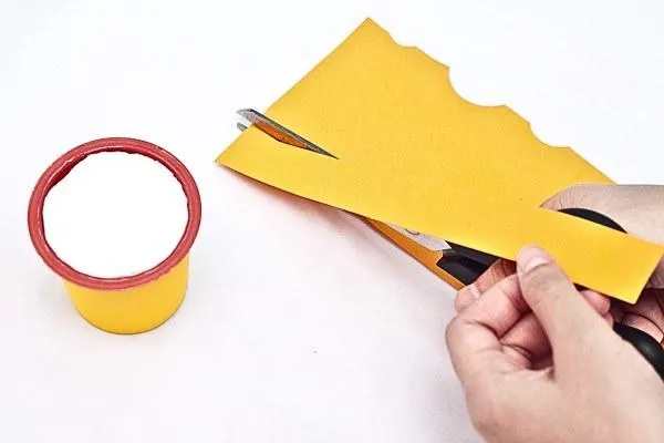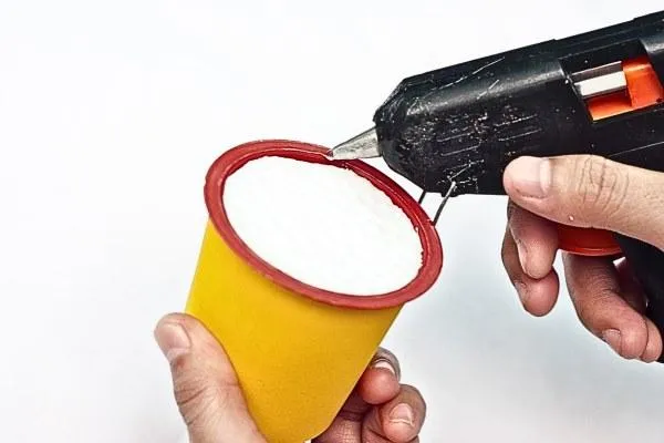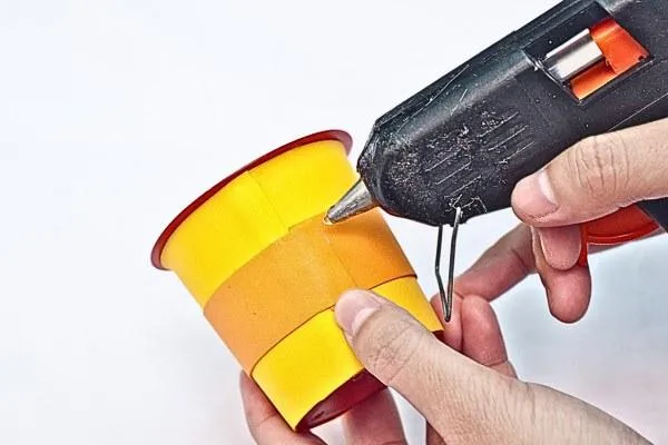 Begin by covering the outside of the plastic cup with double-sided tape. This will help other materials stick to the cup and make the foundation of your decoration.