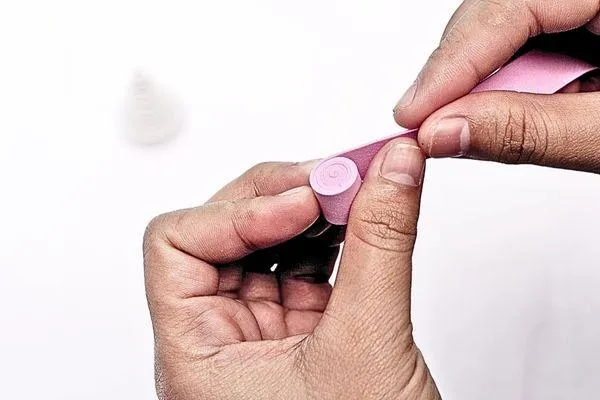 Next, grab a pink sponge paper strip and roll it tightly into a smaller cylinder. Once rolled, seal it at the end with concrete glue. This pink roll will serve as the angel’s head, so make sure its size is proportionate to the body.