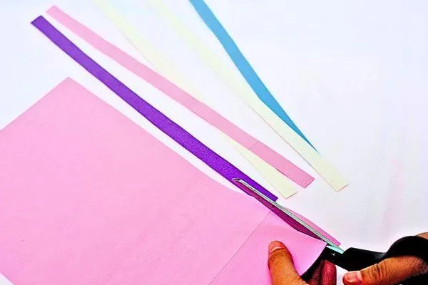 Cut several strips of light blue, white, purple, and pink sponge paper. You can choose the thickness of the strips depending on the final design you want for your angel. Thicker strips will create a bold look, while thinner ones give a more delicate appearance.