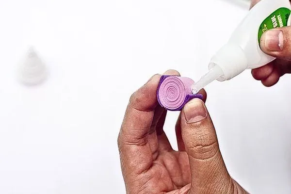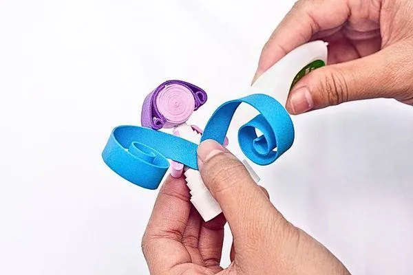 Glue the next pair of rolled purple strips on top of the first ones. Repeat the curling process and let them overlap slightly for a realistic look. Ensure all glued pieces are dry before continuing to the next step.