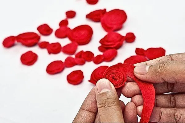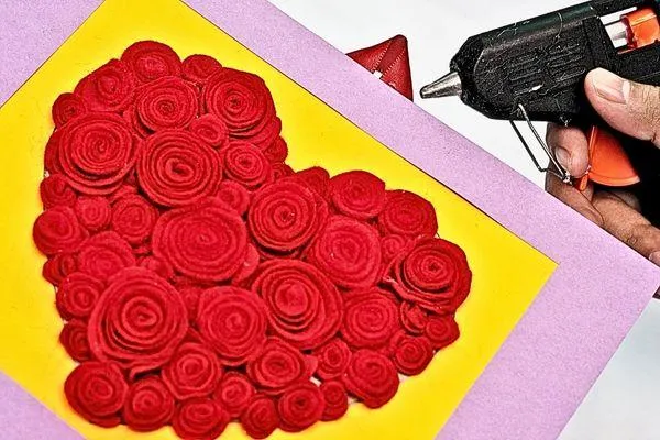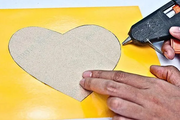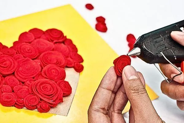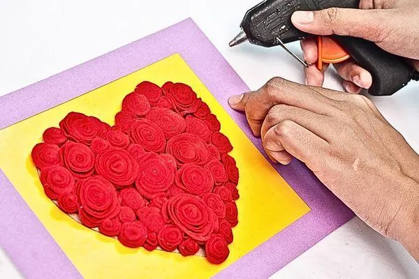 Cut a small flame shape from the yellow sponge paper. Then cut a slightly bigger flame shape from the red sponge paper to create a layered effect. Glue the yellow flame on top of the red to finish the double-layered design.