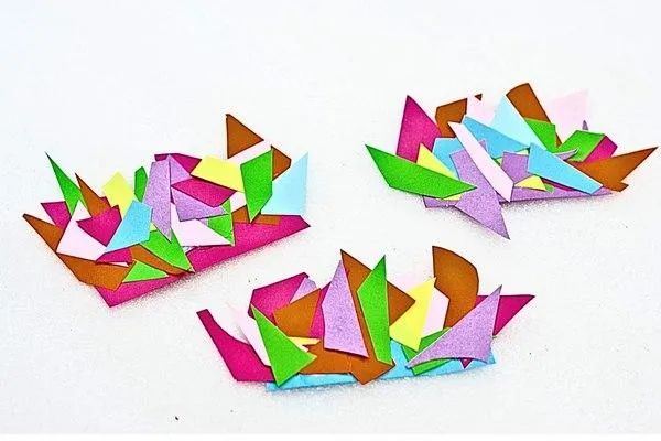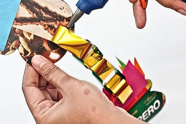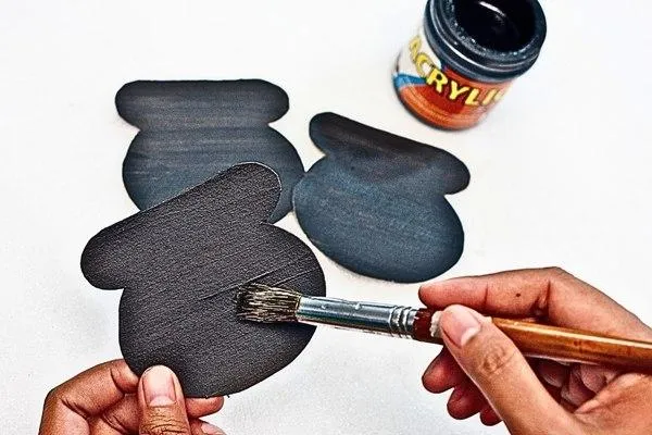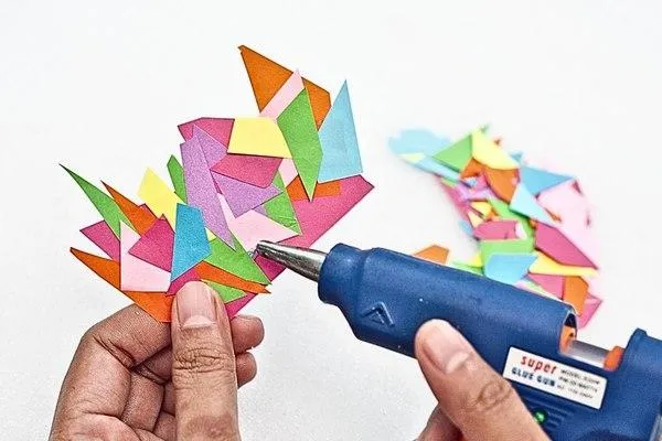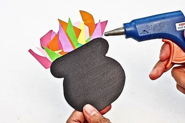Cut a small flame shape from the yellow sponge paper. Then cut a slightly bigger flame shape from the red sponge paper to create a layered effect. Glue the yellow flame on top of the red to finish the double-layered design.