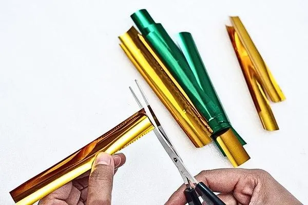 Cut off any excess paper from the rolled candle to ensure the bottom edge is flat. This step makes it easier to attach the candle securely to the wreath later on.