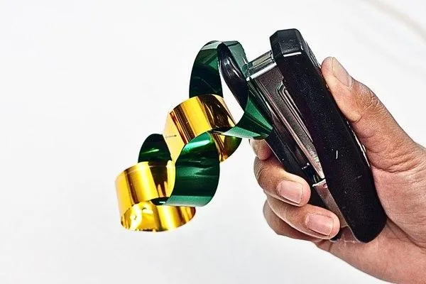 Using the thicker red strip, shape it into a bow. Then take the smaller strip and fold it equally to create a tail. Wrap a small red piece around the center to secure the bow and tail together before gluing.